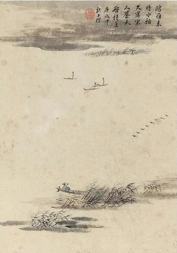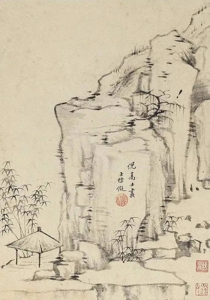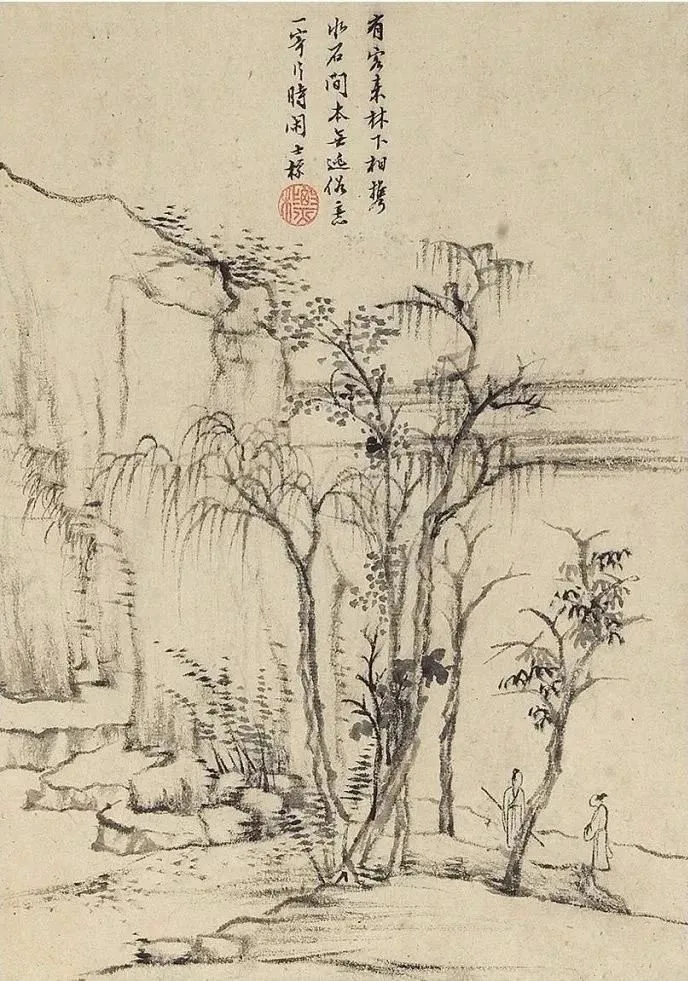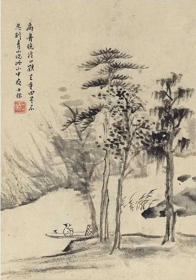 查士标虽宗法倪瓒、吴镇,却从不被风格束缚。他晚年的《四季山水图册》中,春耕图的质朴、秋山行旅的苍茫、待月图的空灵,皆以疏简笔墨呈现,却因题材不同而风格迥异。这种“一画一格”的创作方式,恰似文人以山水为面具,在画中扮演不同角色——时而高逸如倪瓒,时而温润如吴镇,时而又回归自我的懒散风神。