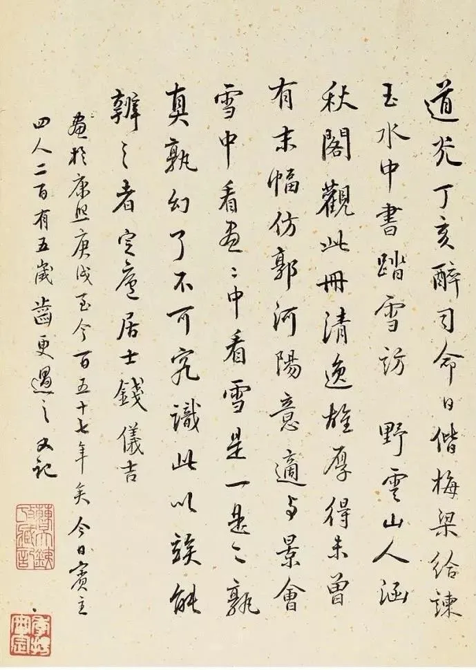 册中多幅作品题跋直白如诗,如“扁舟晚溪口,欲去重回首。不忍别青山,况此山中友”,将倪瓒的高逸转化为文人的留恋;而“生平野性爱林泉,别却林泉已十年”则借山水抒发遗民情怀。更妙的是,他仿沈周《姑苏十景图》却自叹“恨不能窥其涯畔”,仿郭熙《雪图》又与友人踏雪赏画,将临摹行为本身转化为一场“画中戏”——观者既是看画,亦是在看画家如何以画为媒,与古人进行跨越时空的“笔谈”。